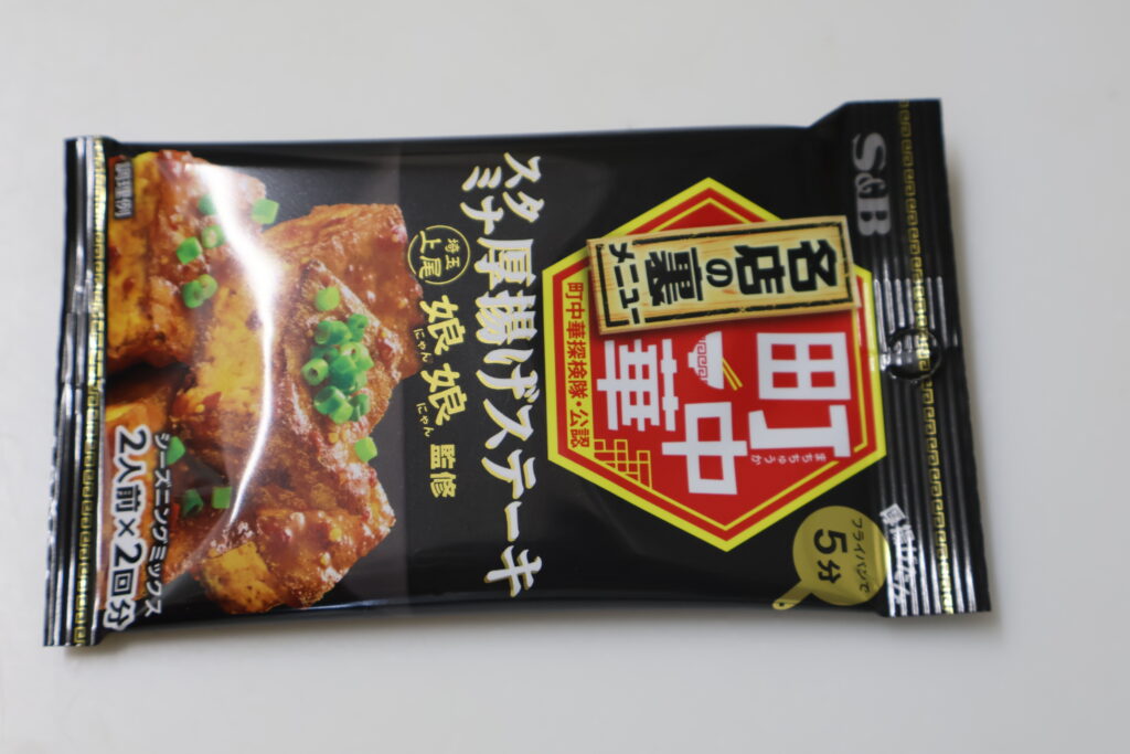 そしてシ-ズニングの「スタミナ厚揚げステ-キ」を1袋と水「大さじ2杯」を
