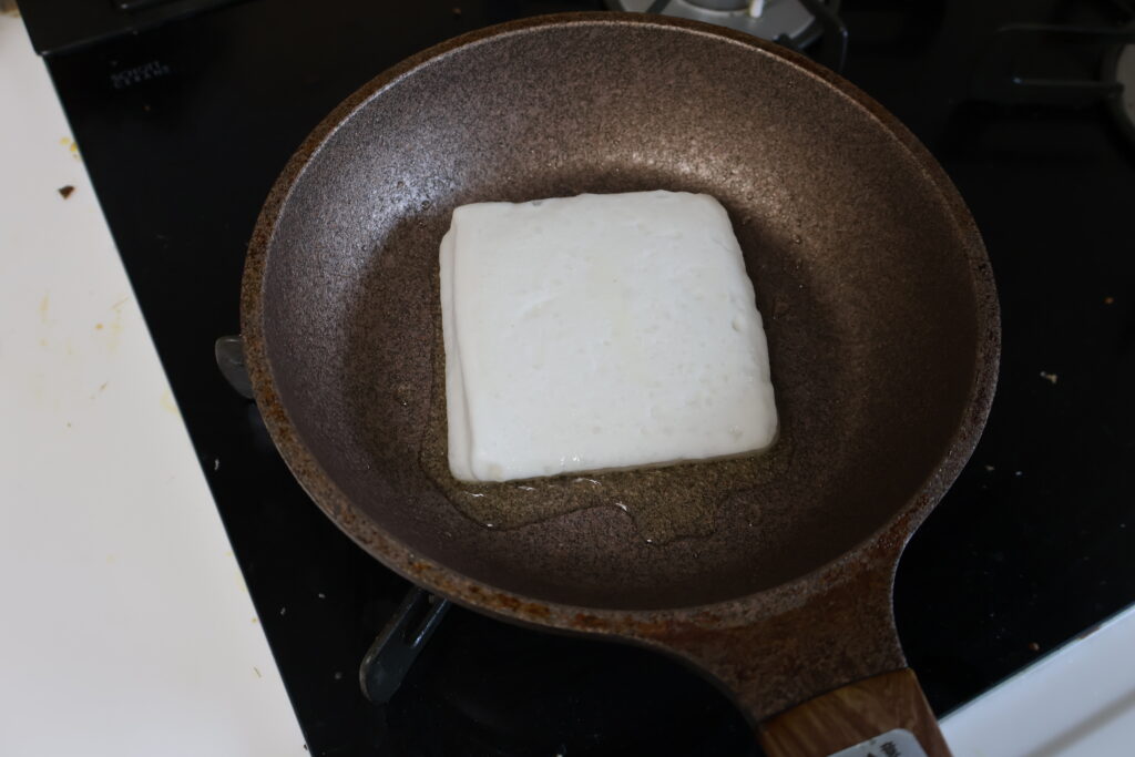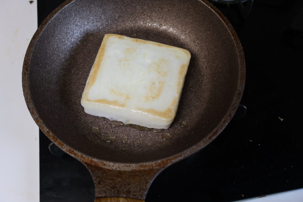 反対側にも焦げ目が付いたら一旦火を止めます。