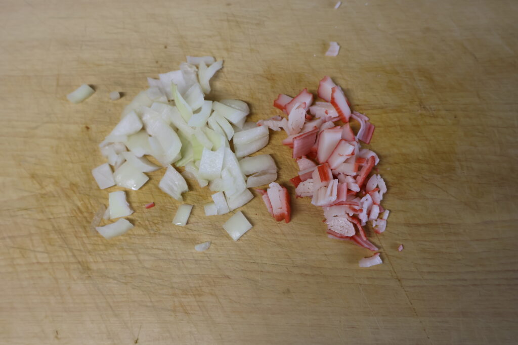 材料はツナ缶1個と玉葱適量とカニカマ2本です。