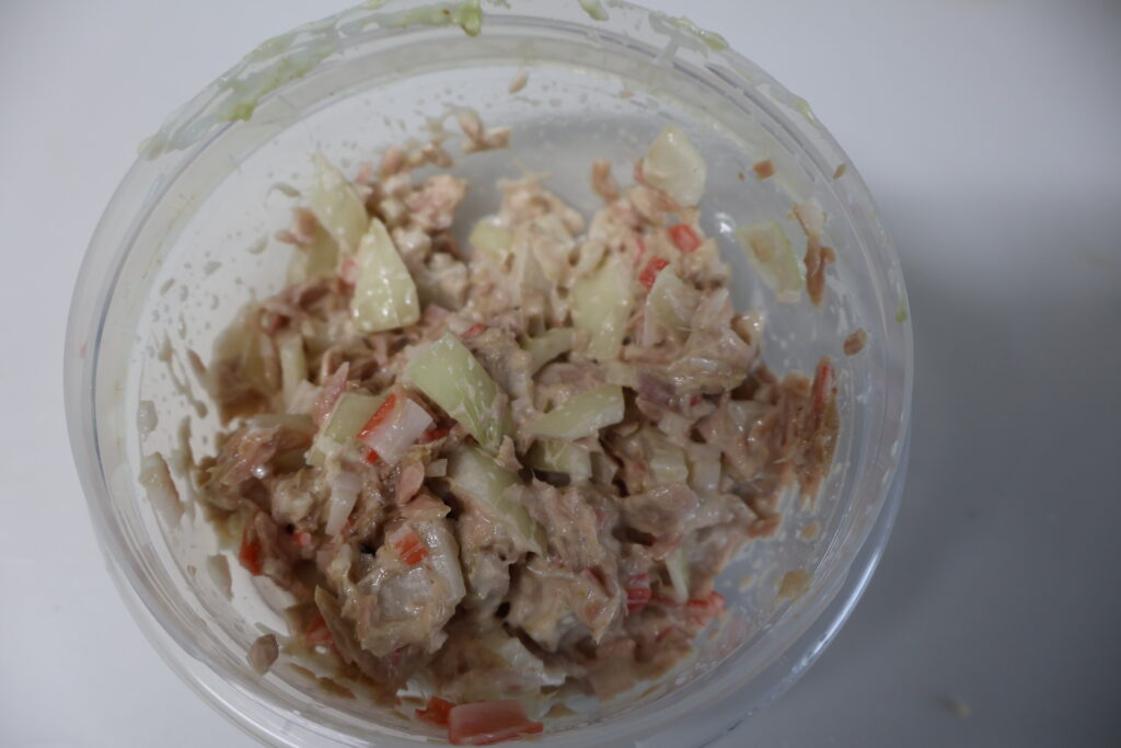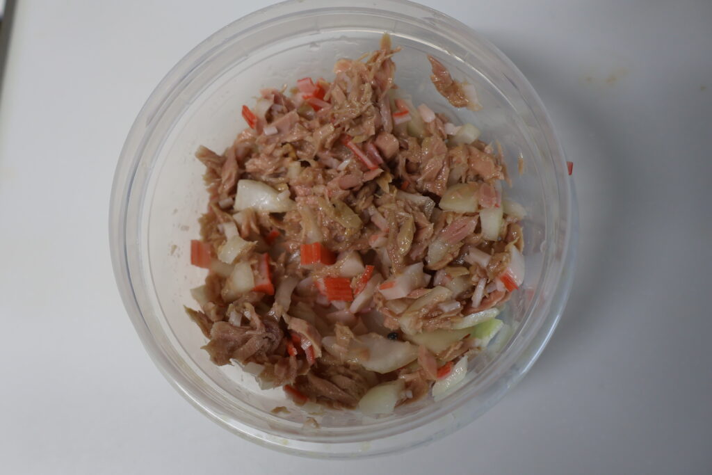 容器にツナと微塵切りにした玉葱とカニカマを入れます。