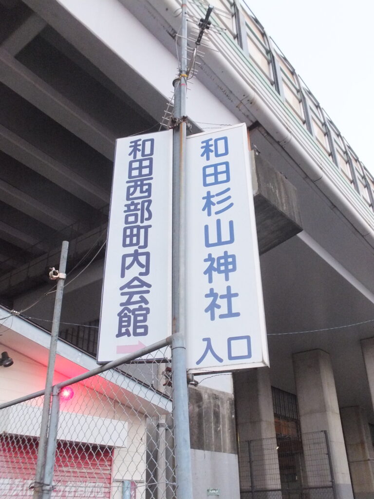 高架下に案内看板があり右側に行くと「和田杉山神社」だそうで折角なので