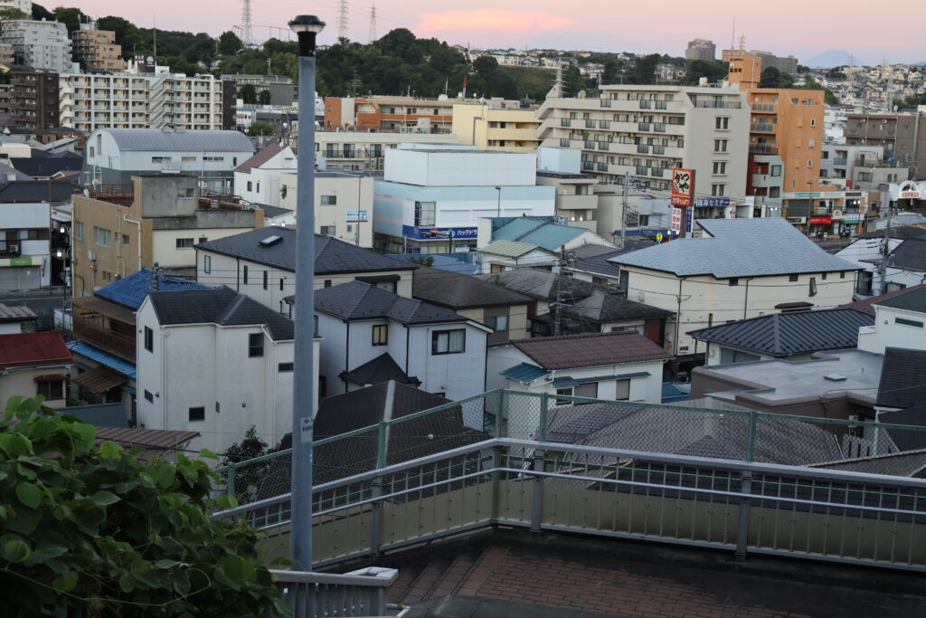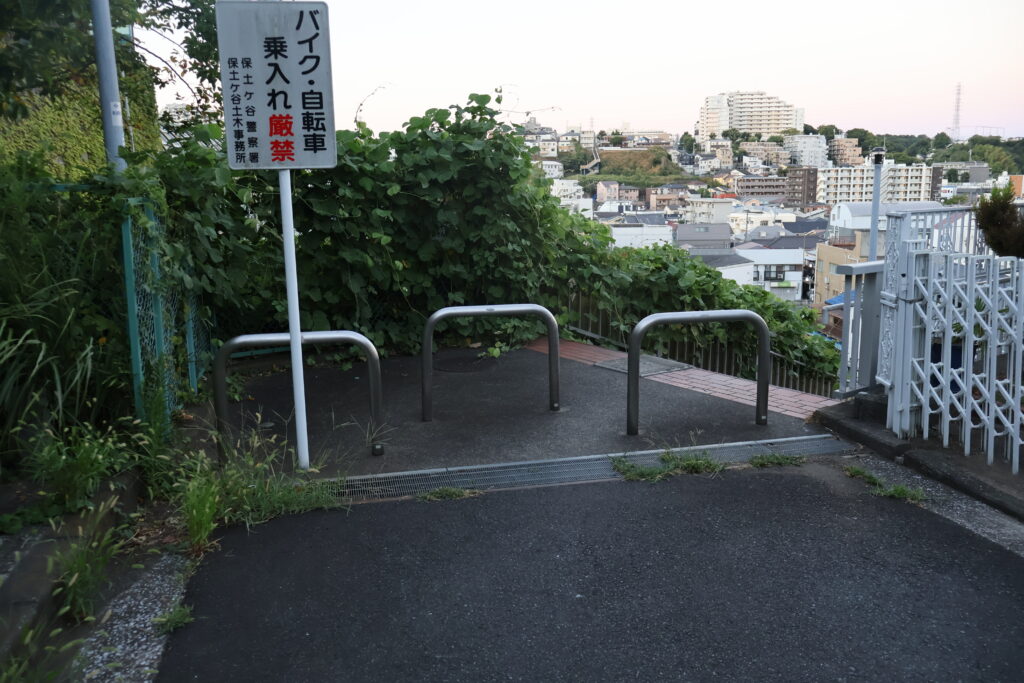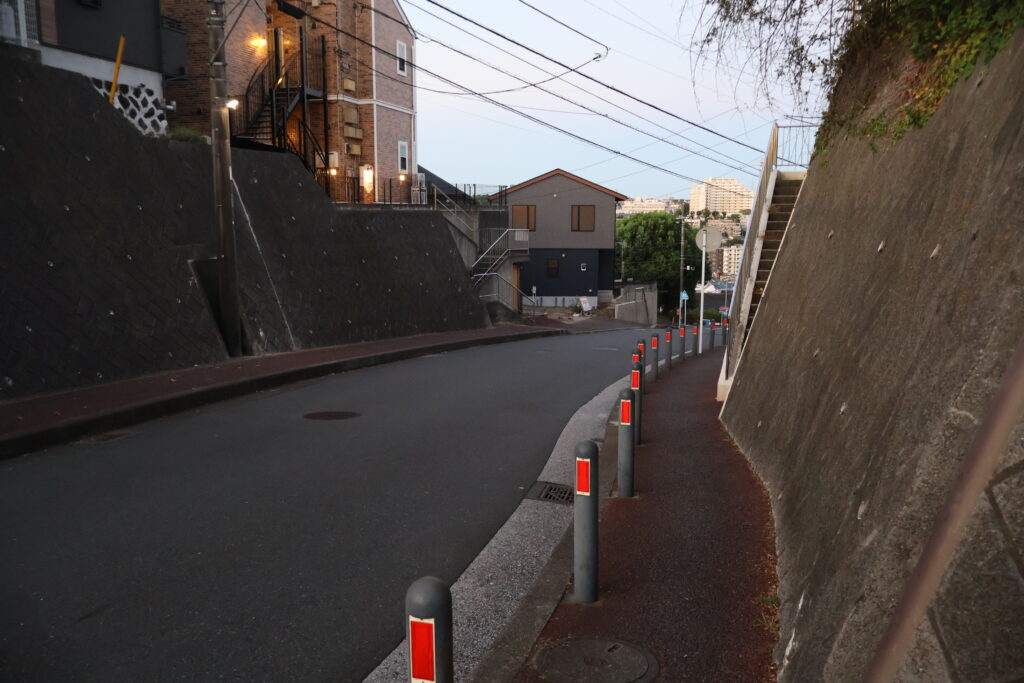 踊場の右側に通ってきた「かつや」が見えますねぇ(p_-)