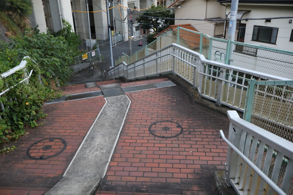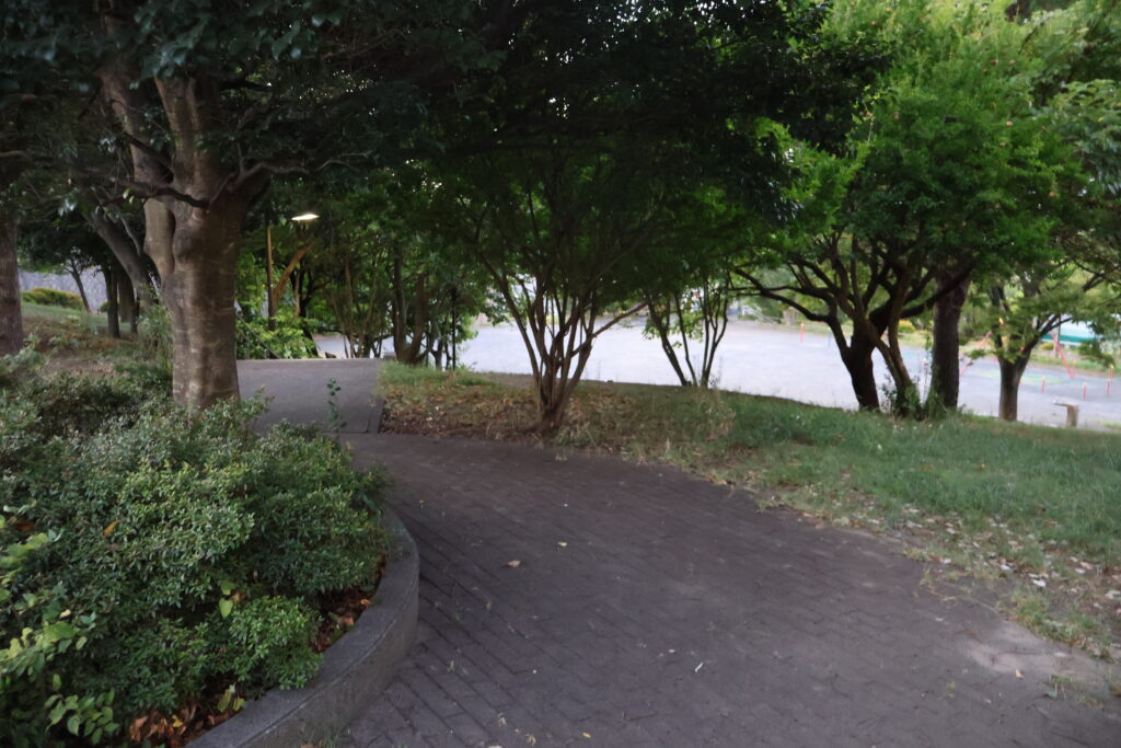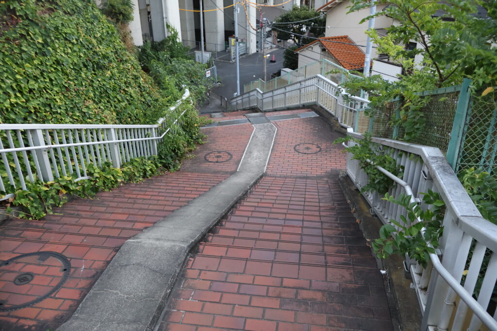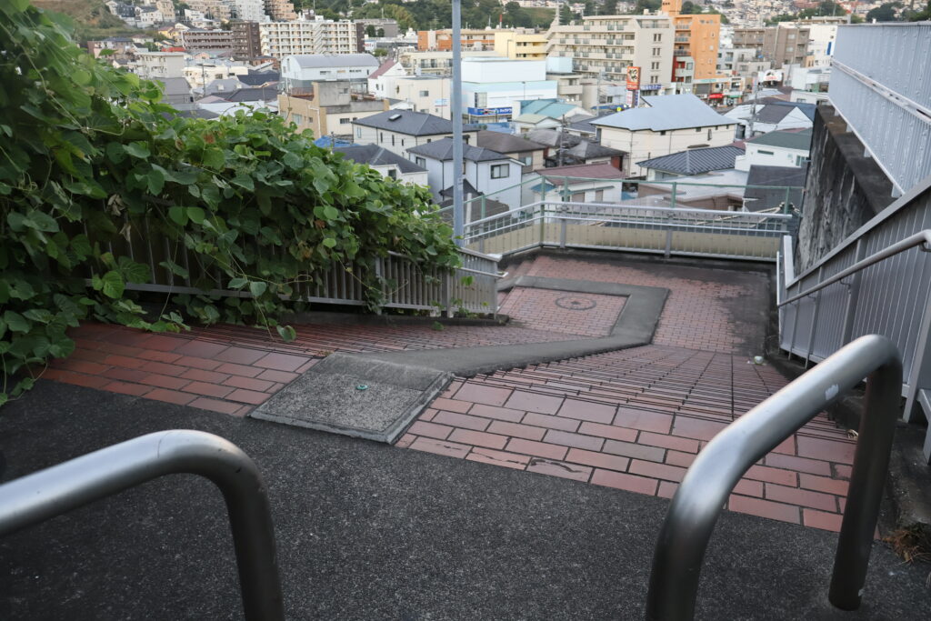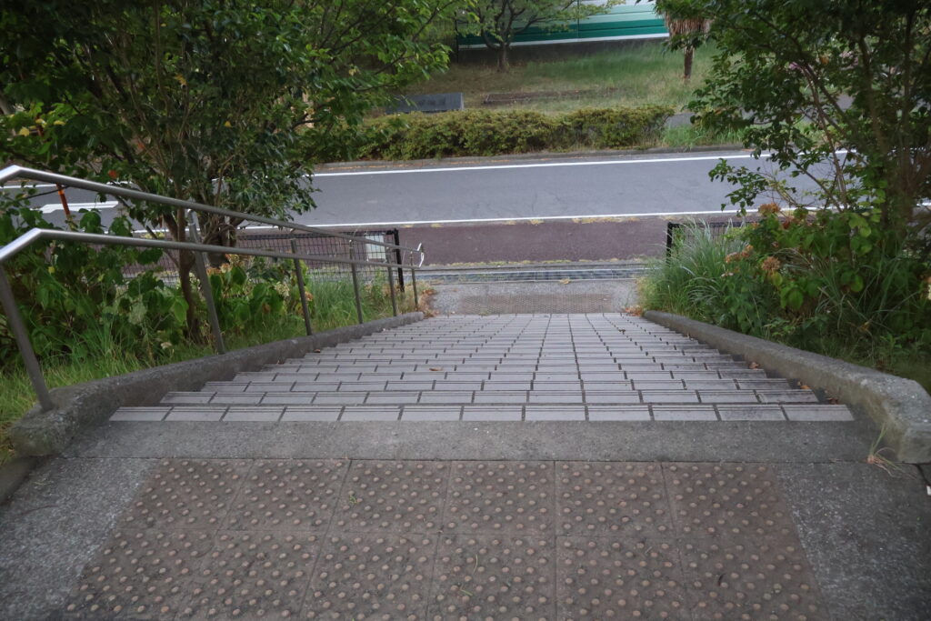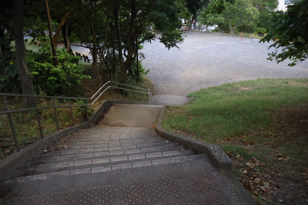 この先の右側の階段を降りて公園出ましょう。