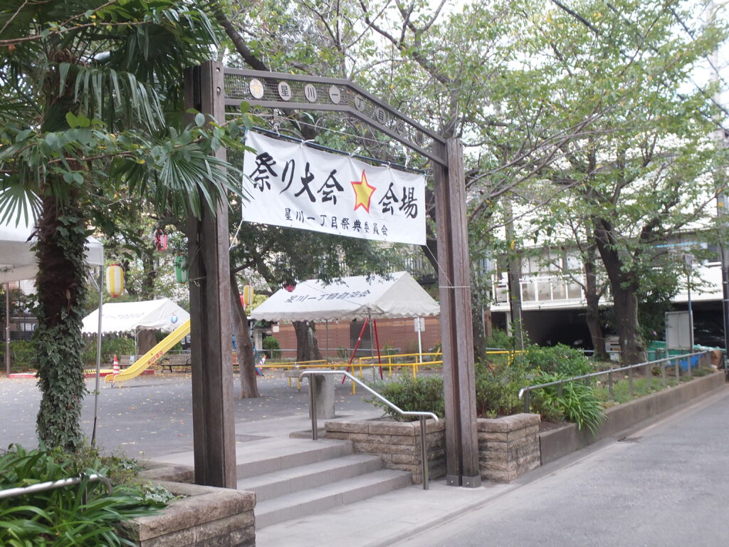 すると左側に「星川一丁目公園」があり「祭り大会会場」の垂幕が