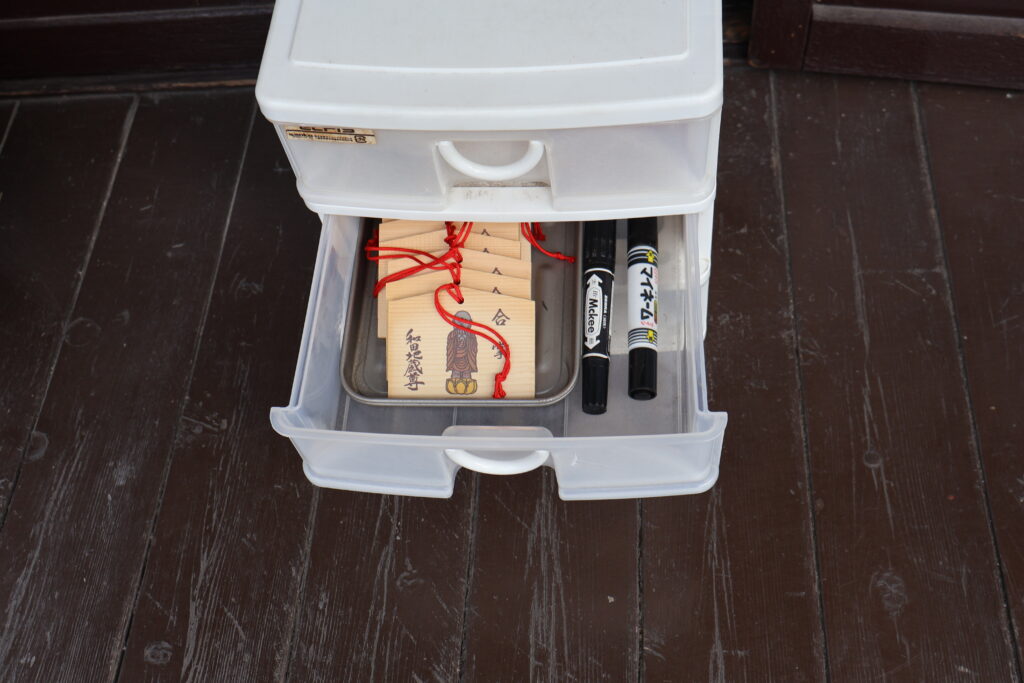願い事があれば下の段には絵馬とマジックがあり願い事を書いてお供えして