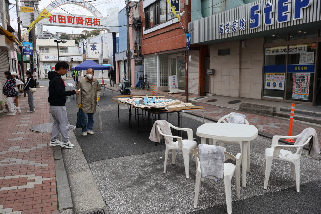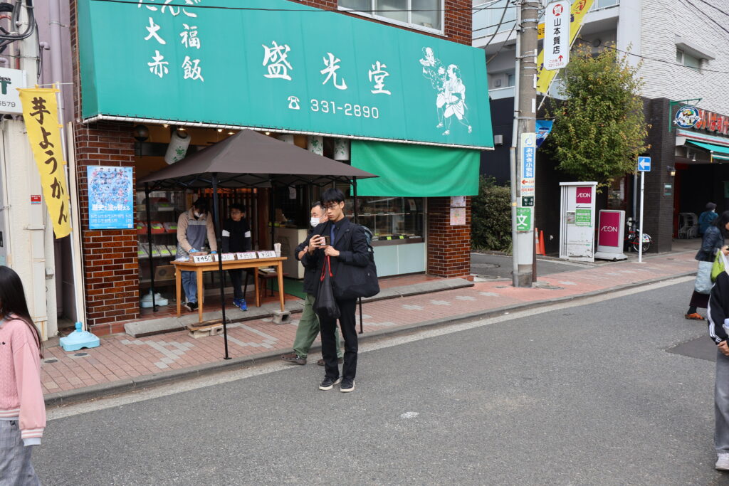 店の前では「大福と団子セット」や「赤飯」などがサービス価格で販売して