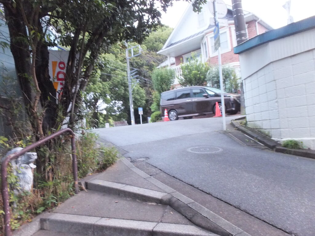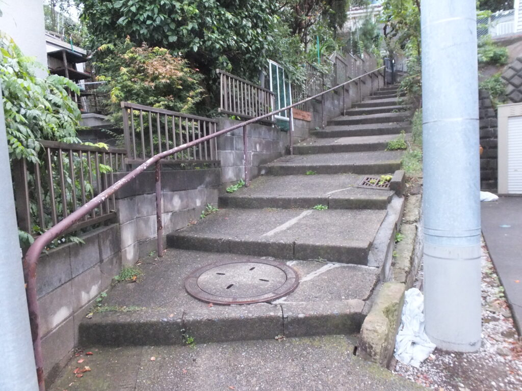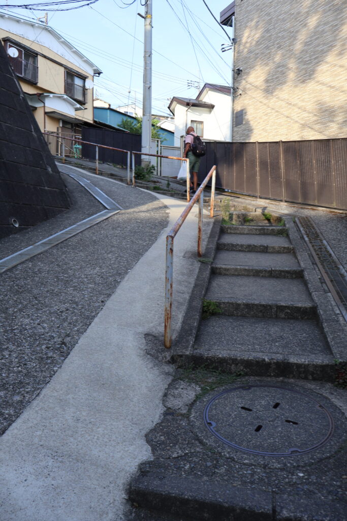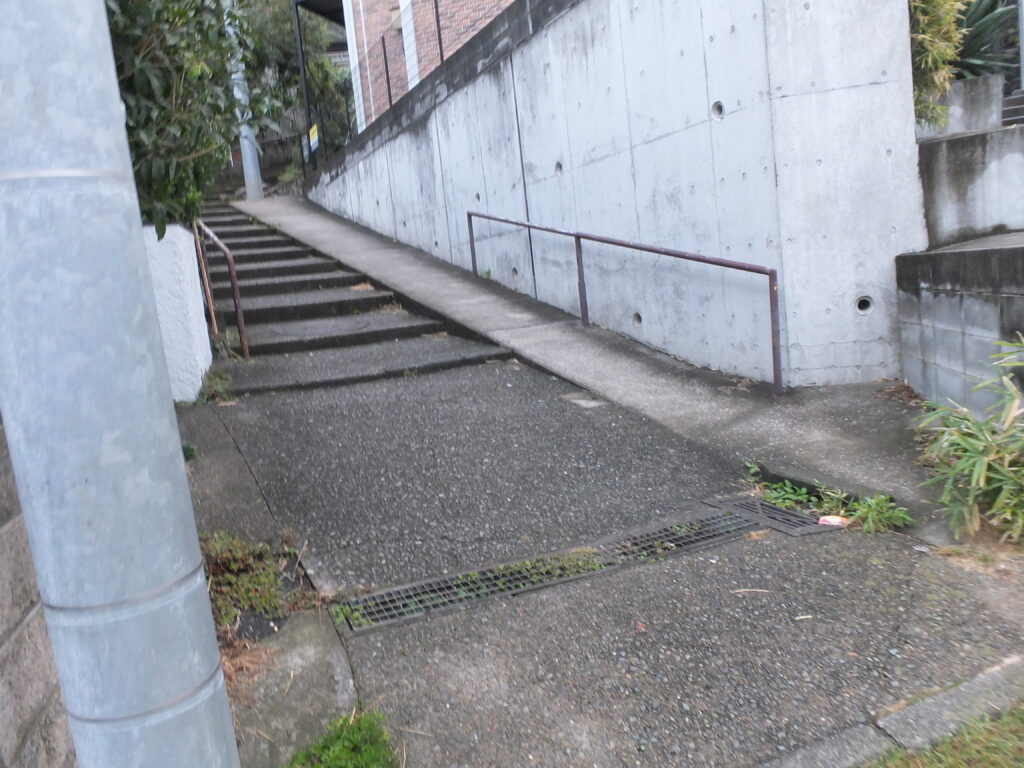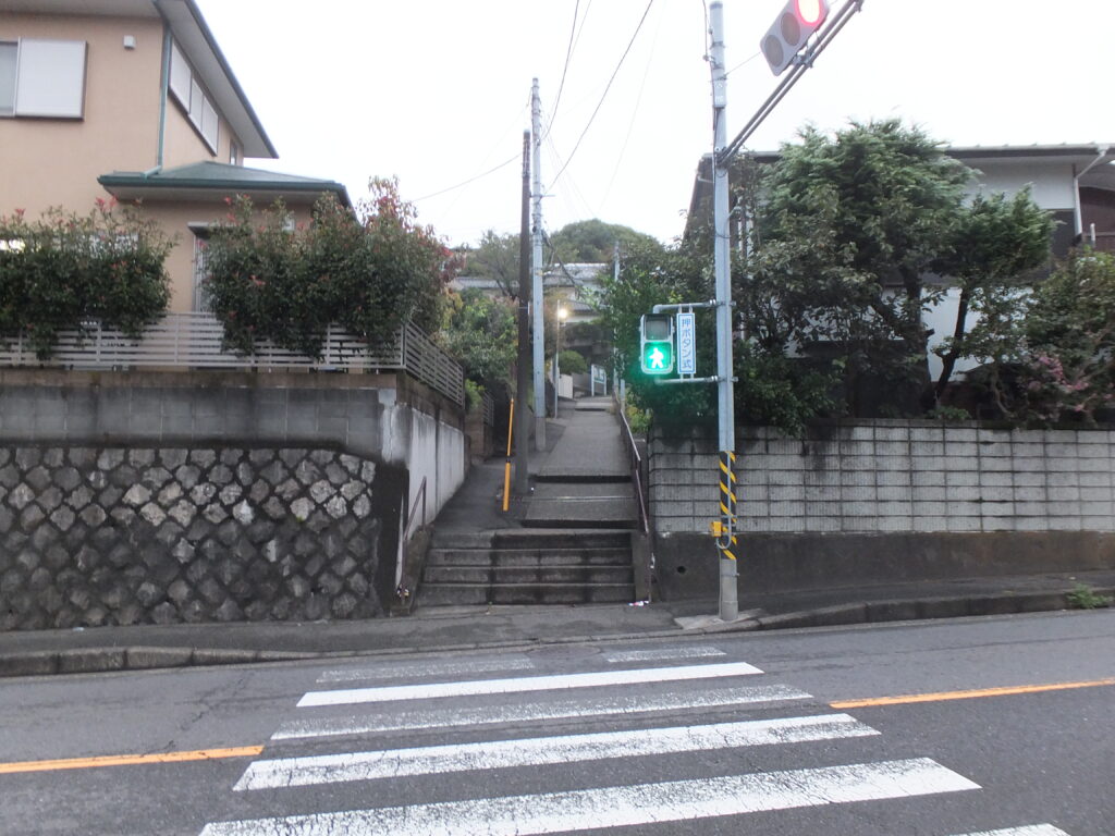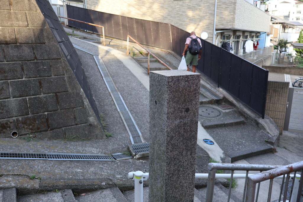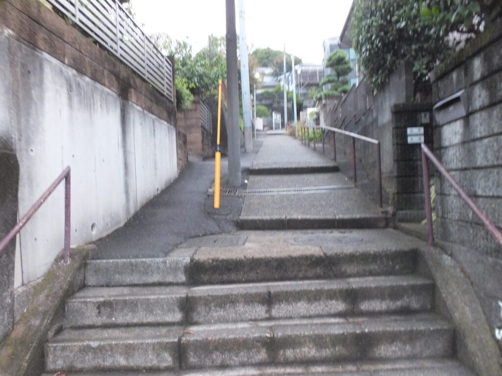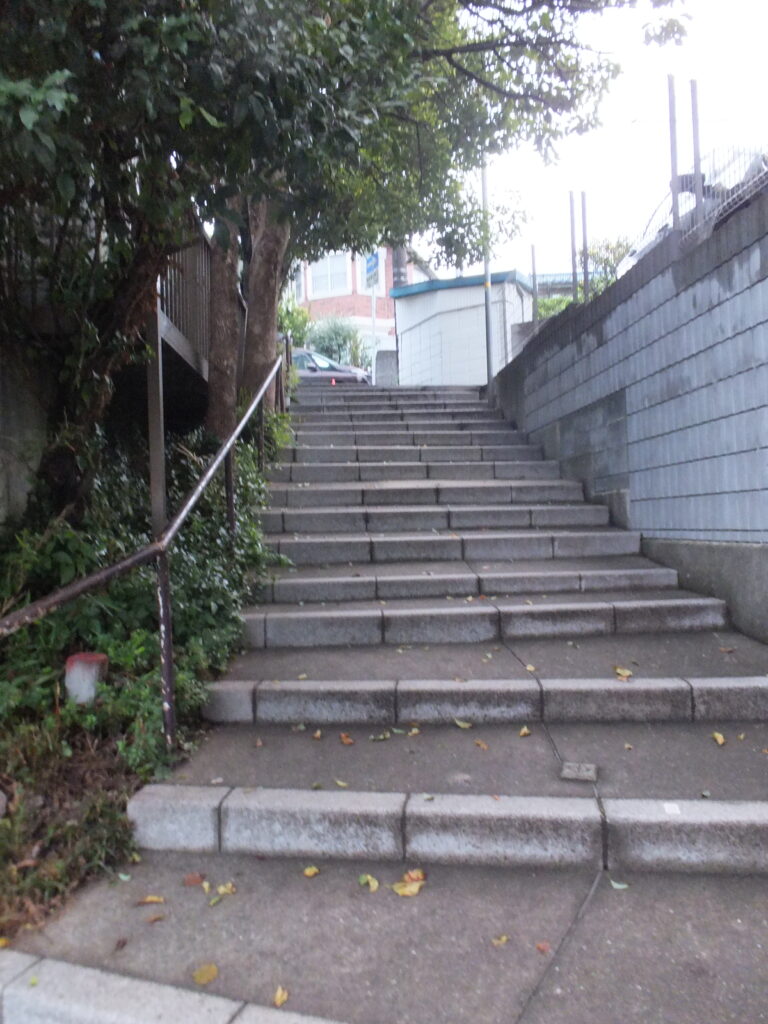 この先左側の電柱の先の手前階段を登って行きましょう。