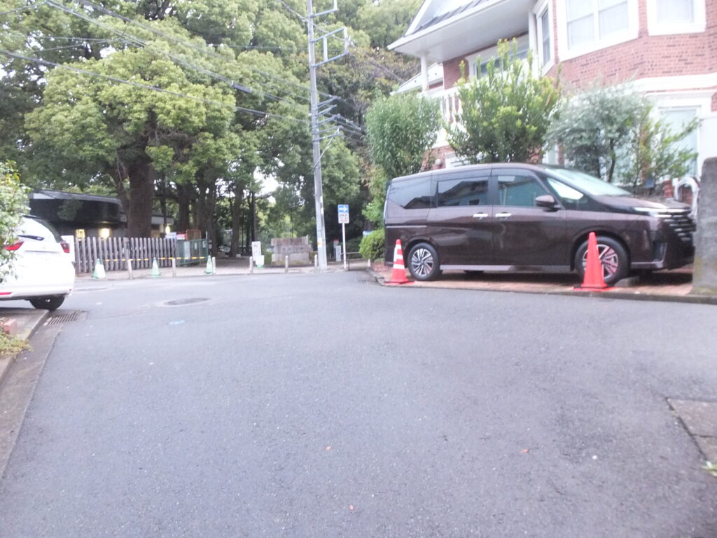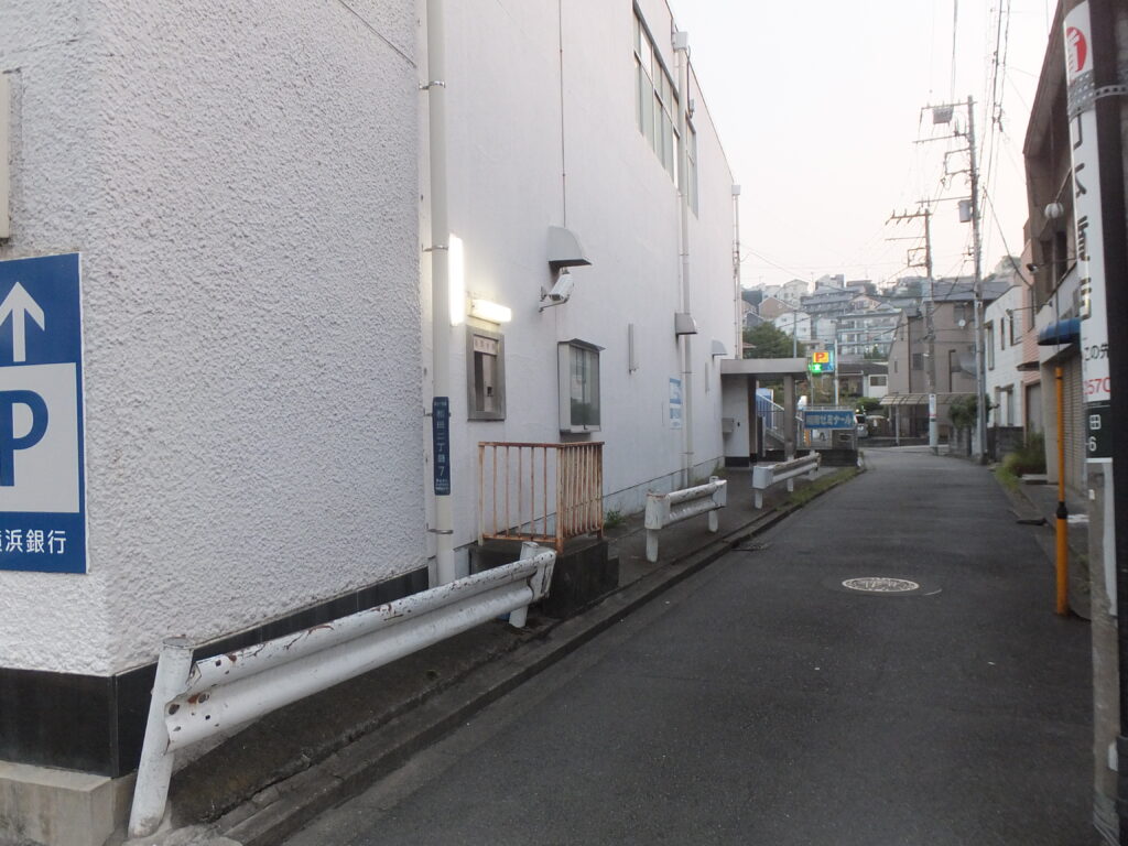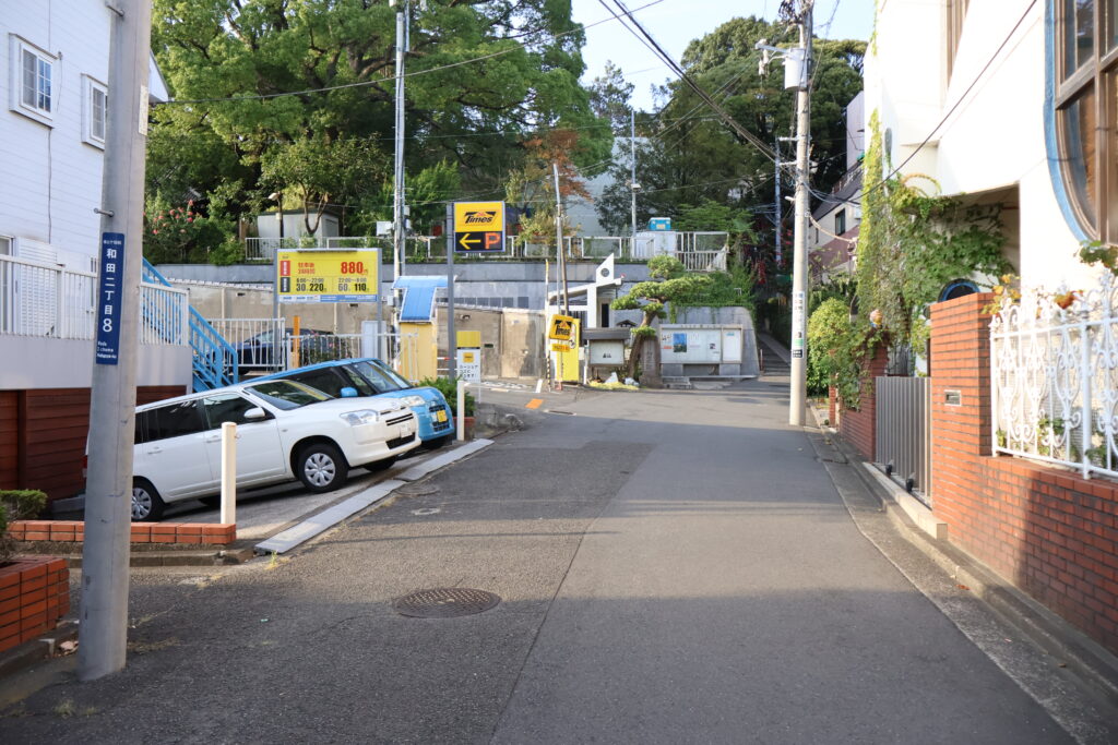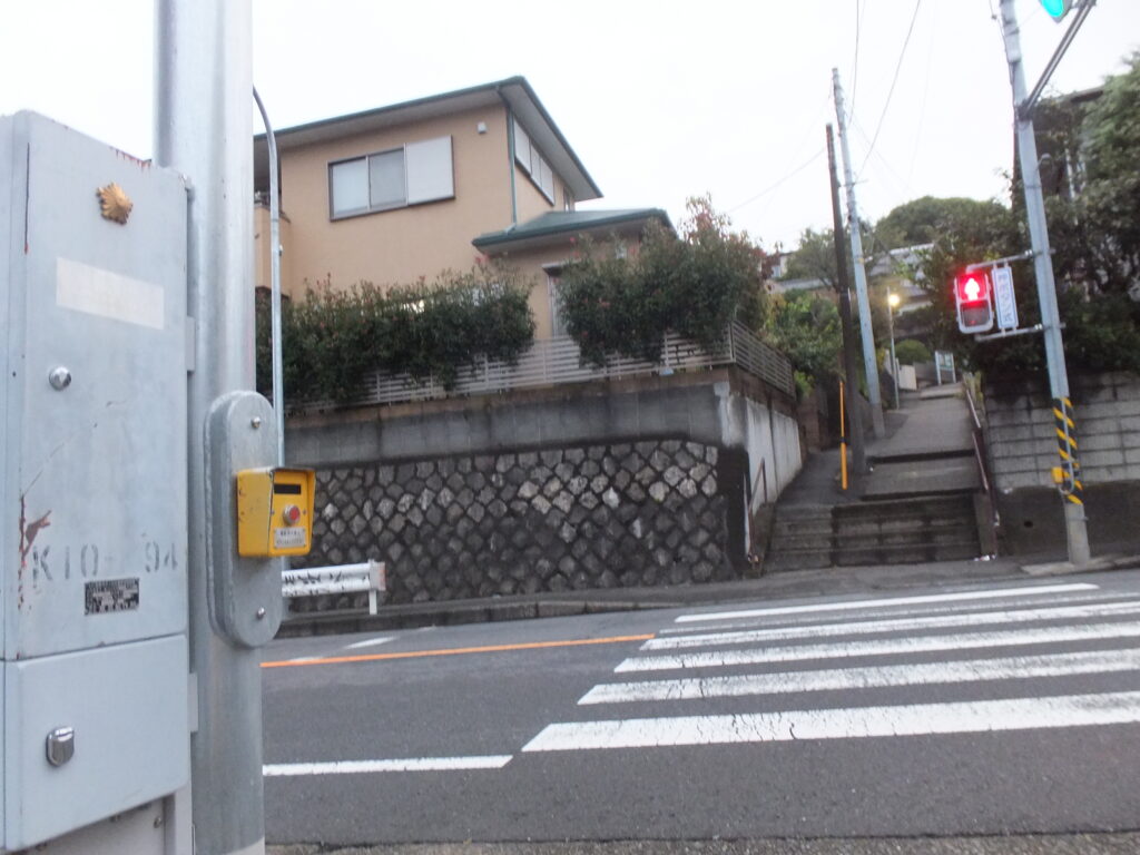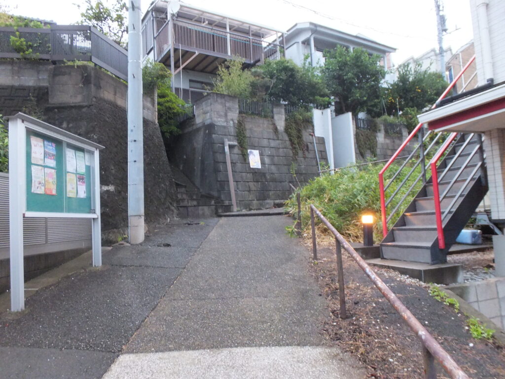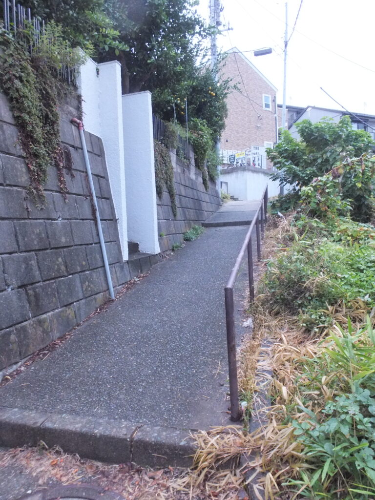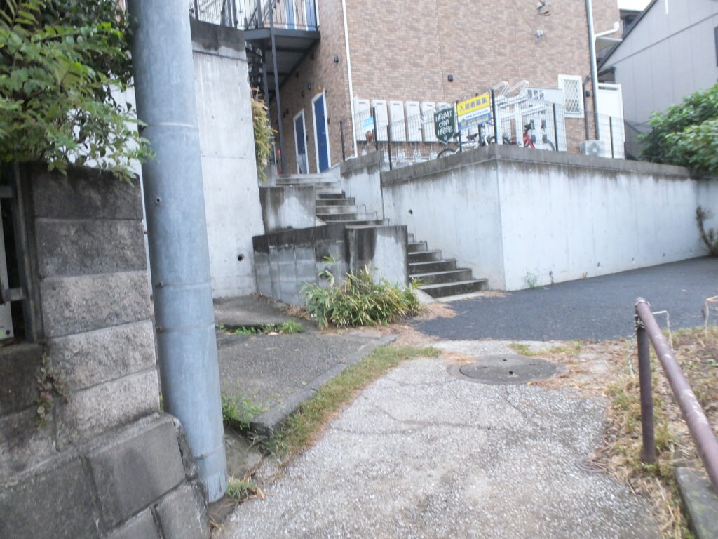 この先左側の電柱の先の手前階段を登って行きましょう。