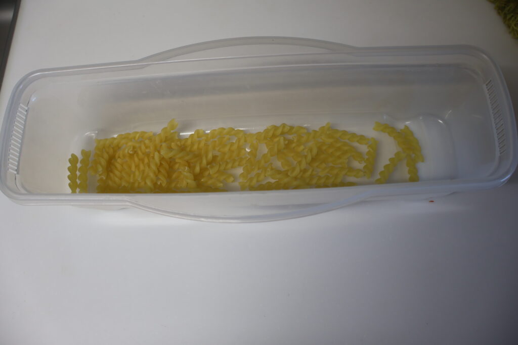 先ずパスタを茹でます。今回も電子レンジで出来る容器を使用します。