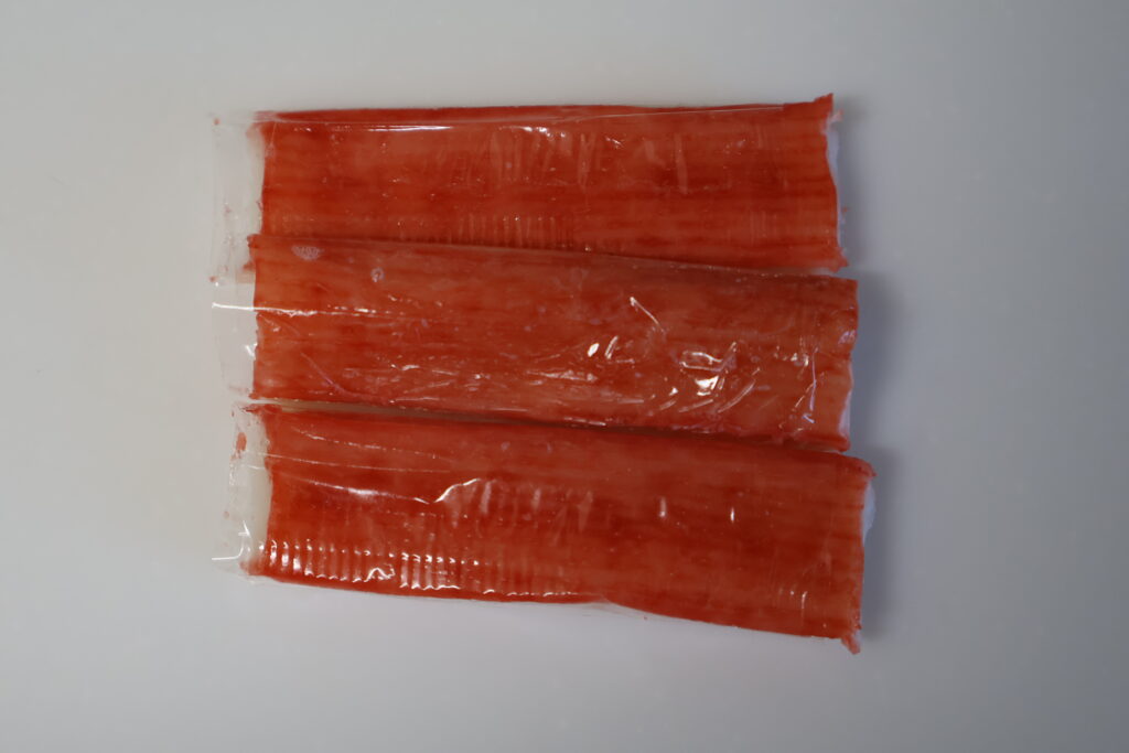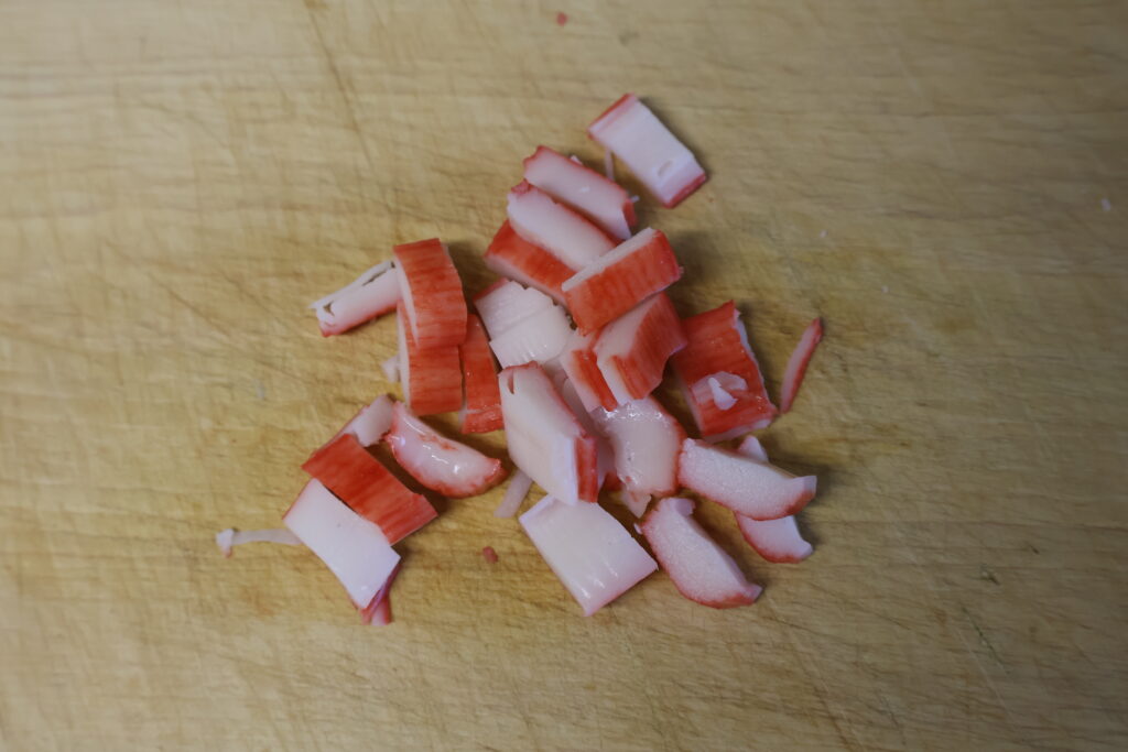 先ずカニカマ3本を小間切れにします。