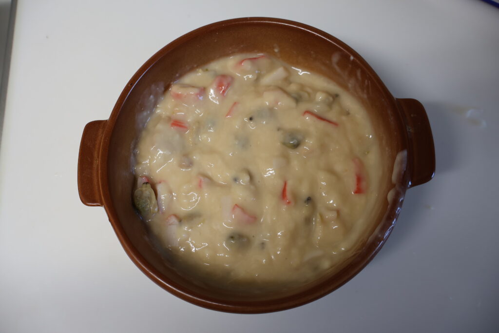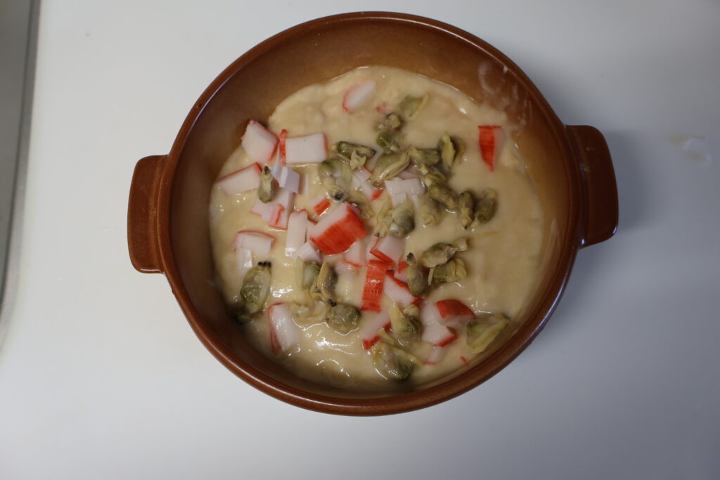 出来上がったら小間切れのカニカマとあさりの水煮を半分入れます。