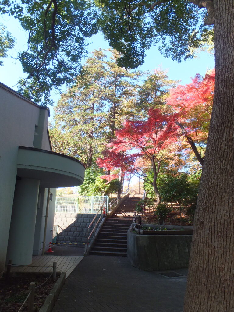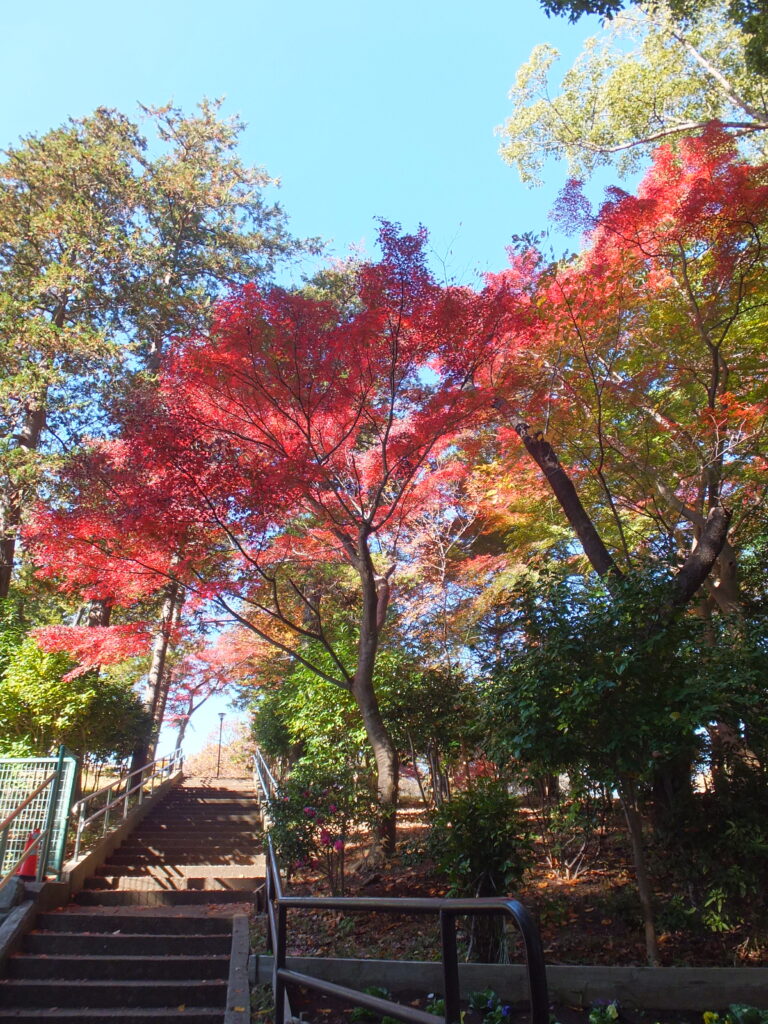 トイレを左側に行くと階段があり早速紅葉が見えますねぇ(p_-)