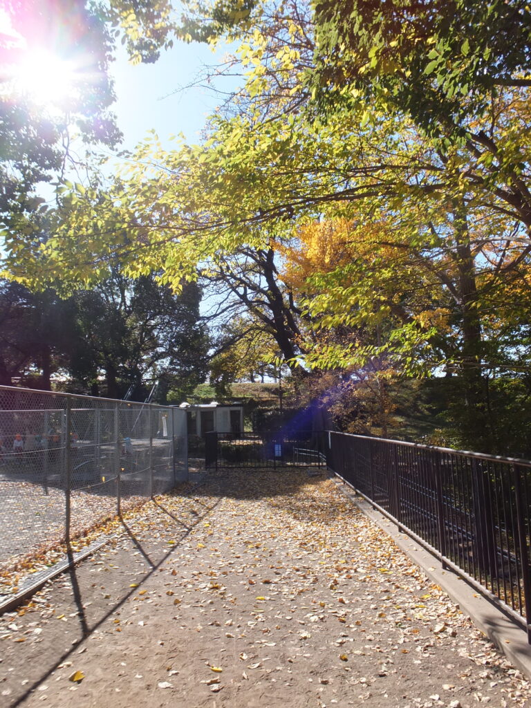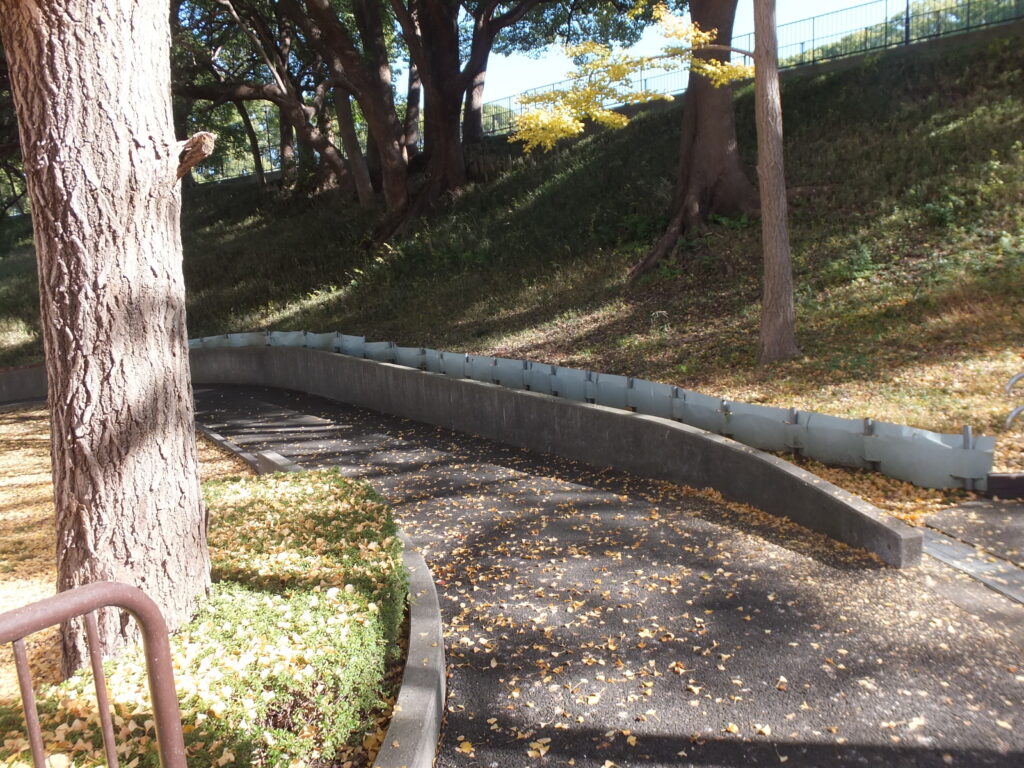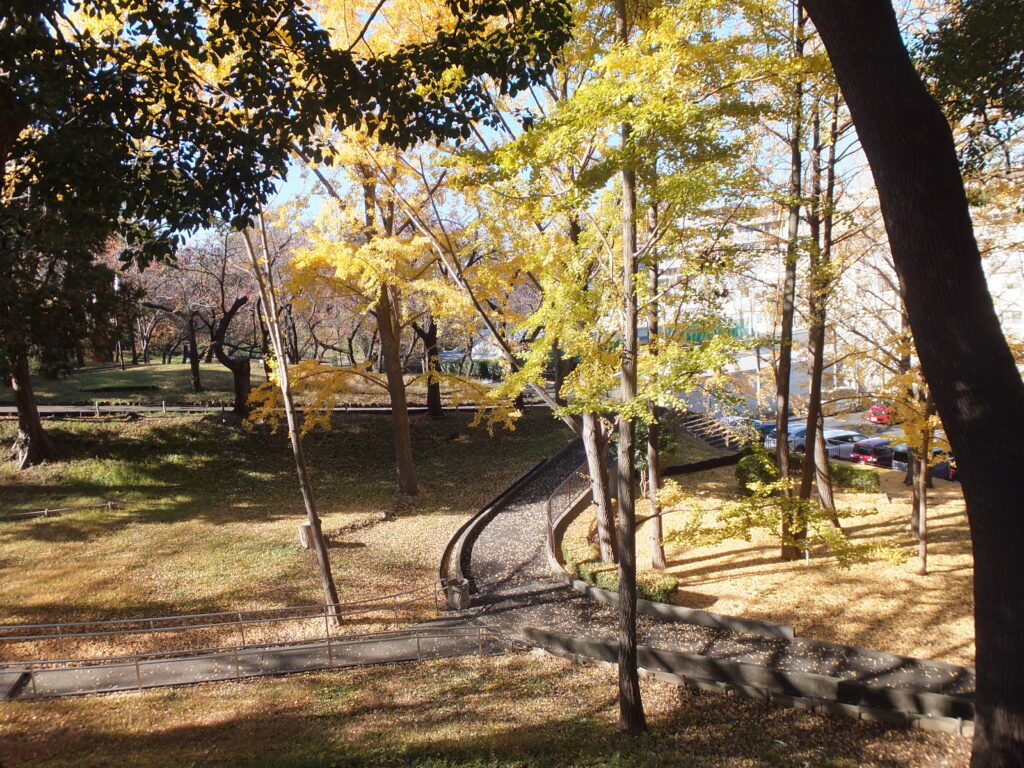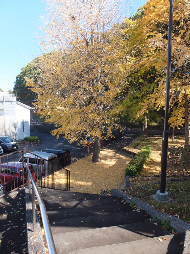 銀杏の葉の絨毯をそのままにしたいので階段を降りずに右側に行きましょう。