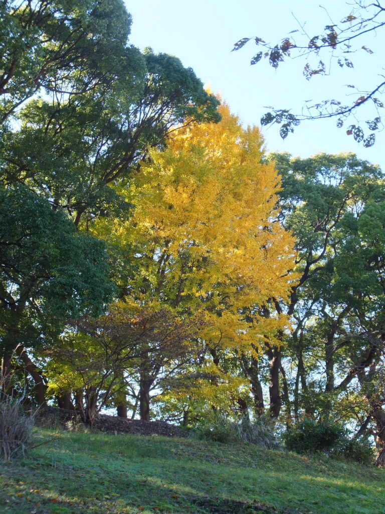 左側に1本黄色く色づいた銀杏がありますねぇ(p_-)