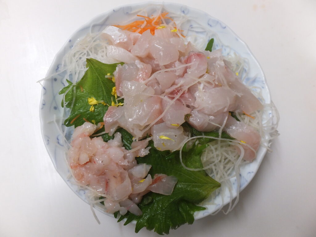 その間に刺身をブツ切りにし「ツマ」と大葉の上にのせておきます。