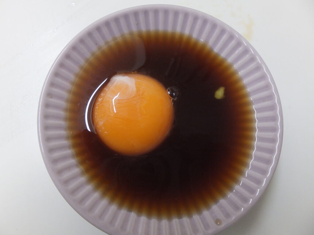 まず「そばつゆ」に黄身を漬けておきます。好みでそばつゆにワサビを