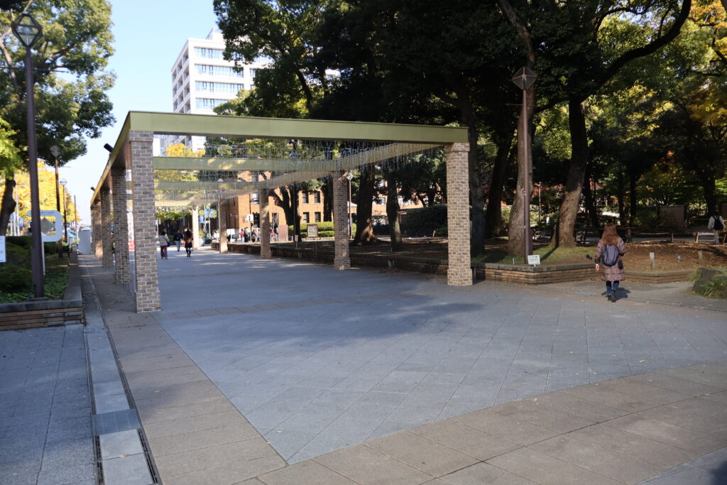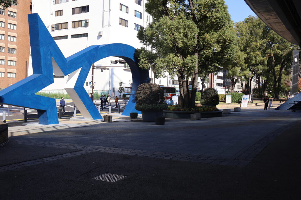 この先の出入口にあったオブジェの横を抜けて公園を出ましょう。