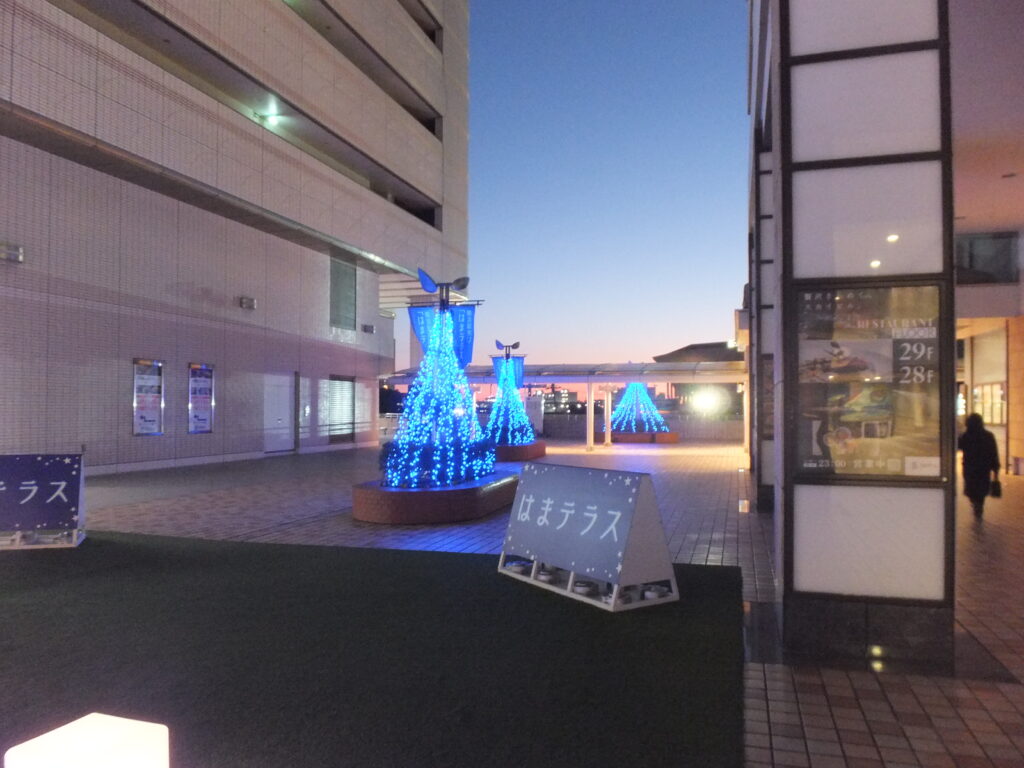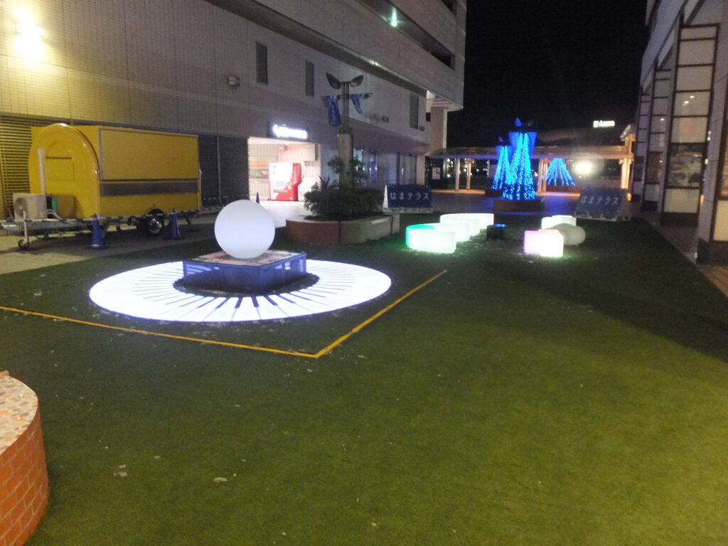 この先に「はまテラス」の看板があり、その後ろに光るオブジェが並んで