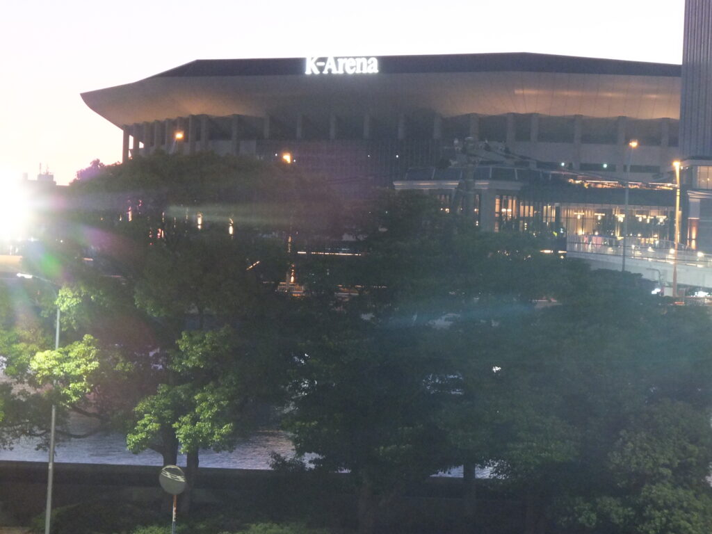 この先には新しく出来た「K-Arena」が朝日に輝いて見えますよ(p_-)