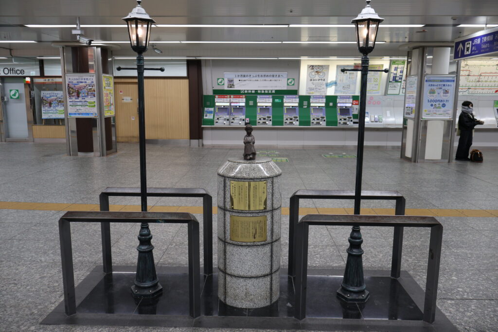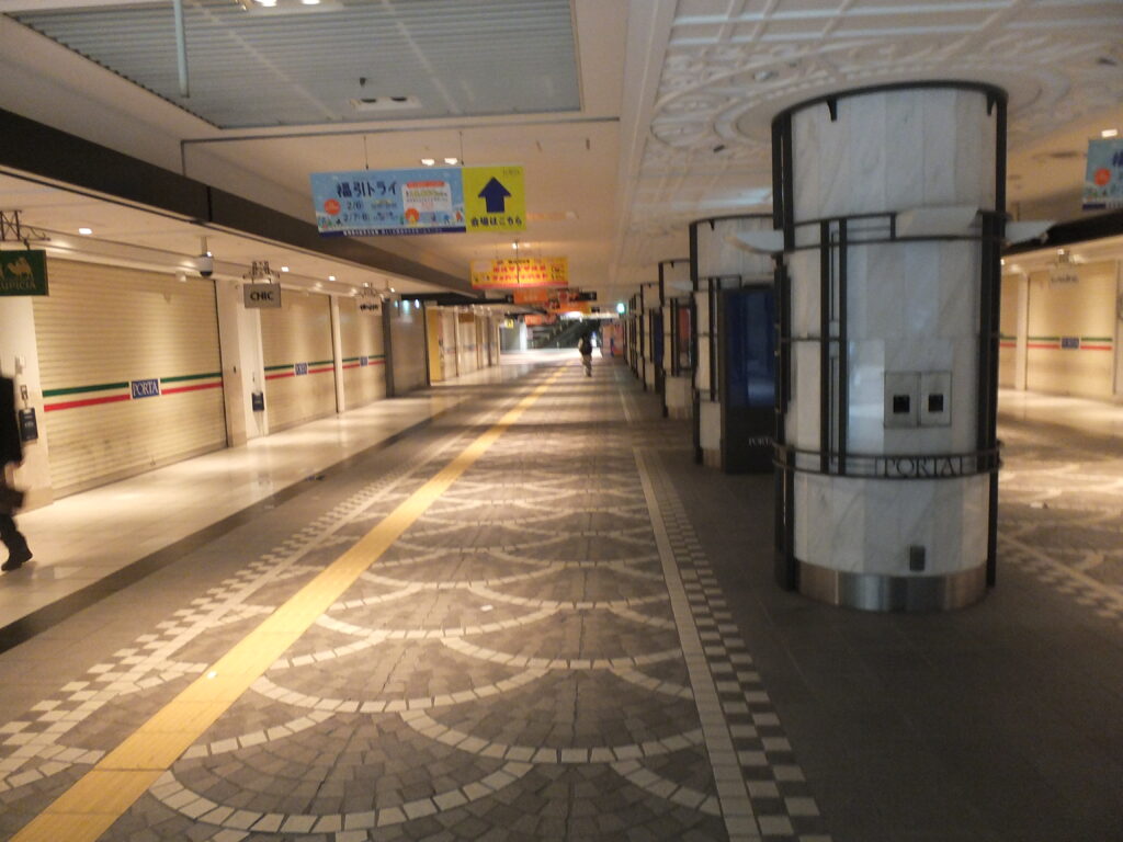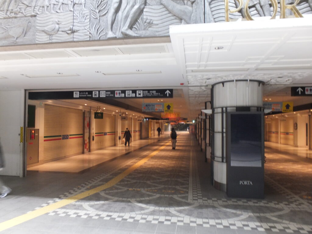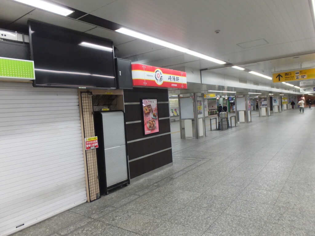 左側の崎陽軒の販売店の先に「赤い靴」の像が見えてきました(p_-)