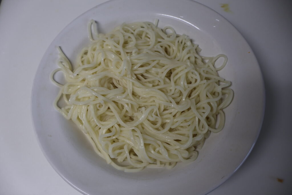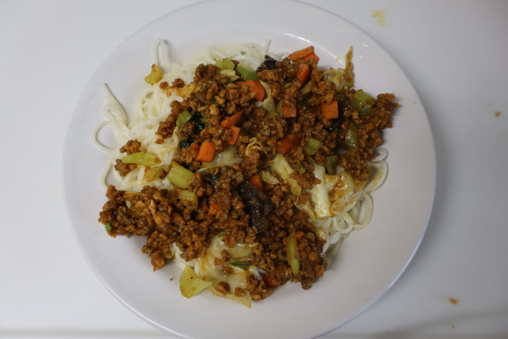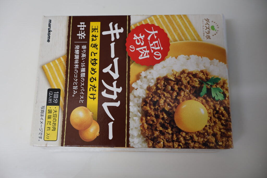 今回は市販の「大豆ミート」のキ-マカレ-が100円だったので冷麦を使った