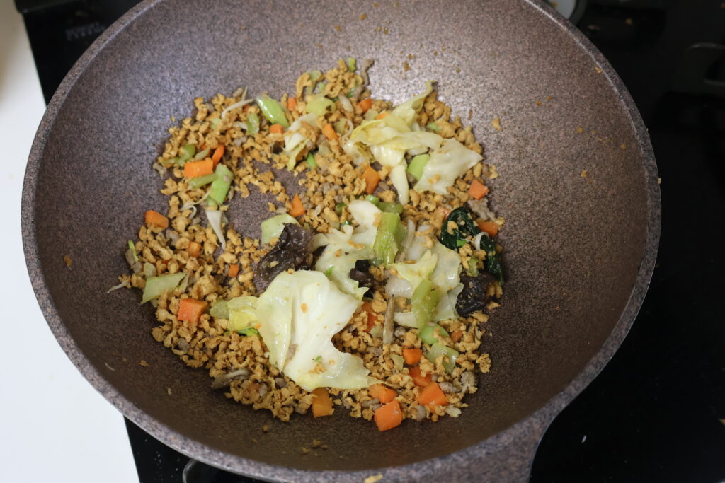 その間にフライパンに油を引き好みの野菜と付属の大豆ミートを炒めます。