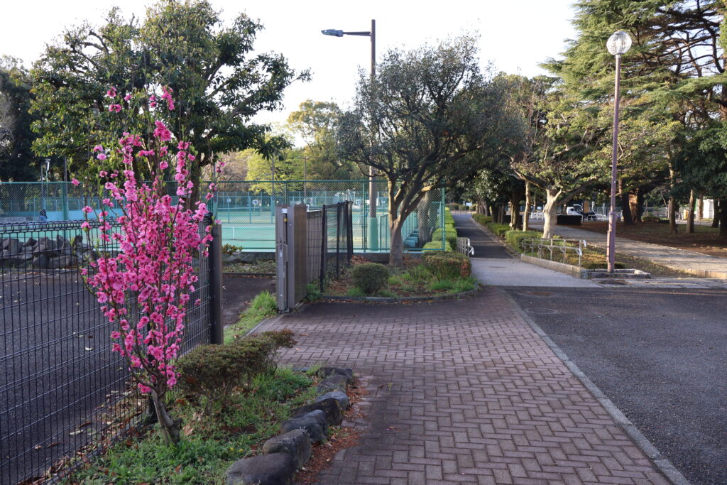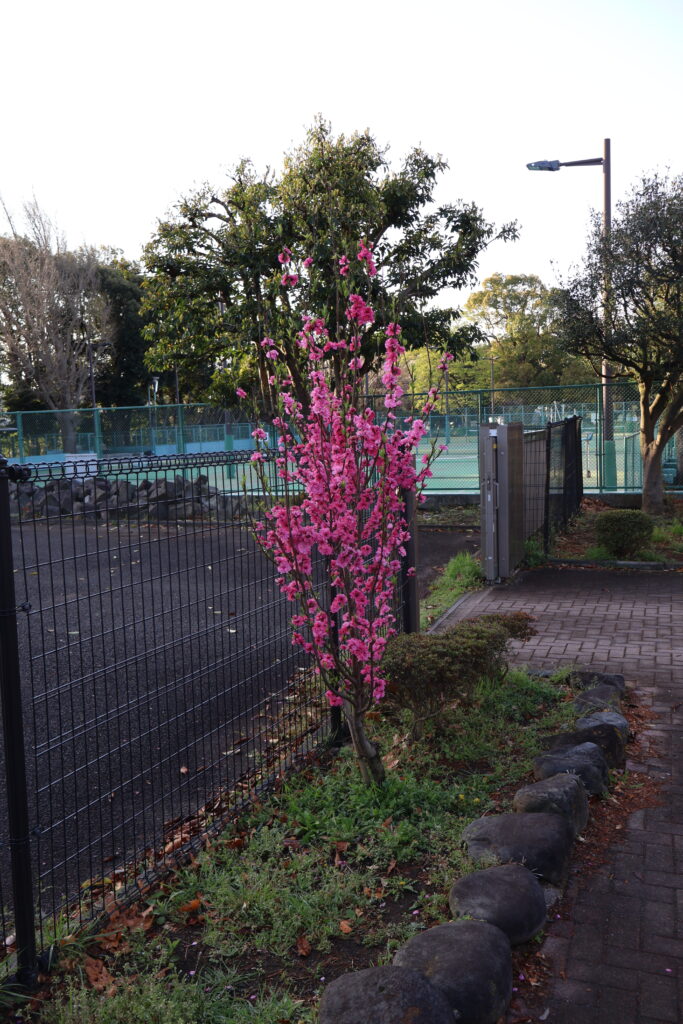 テニスコート手前に小振りの桃色のカイドウが咲いていましたよ!(^^)!