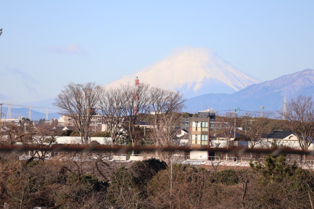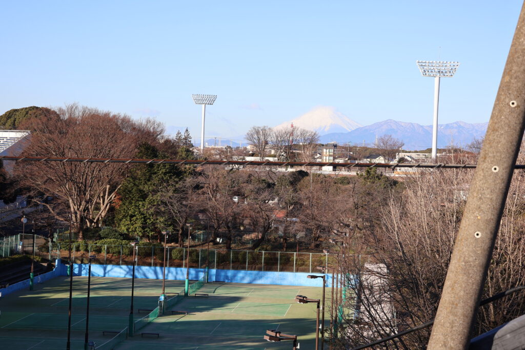 更に歩道橋を進んで行くとテニスコートに富士山が