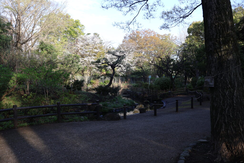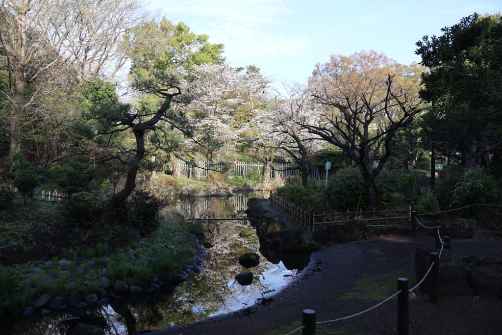 桜が咲いていて灯籠もあり更に日本庭園らしさが増していて休息するには