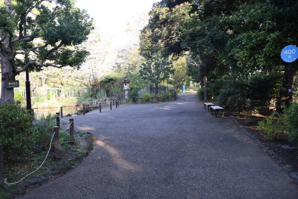 このまま池を左側に見ながら真っ直ぐ行きましょう。