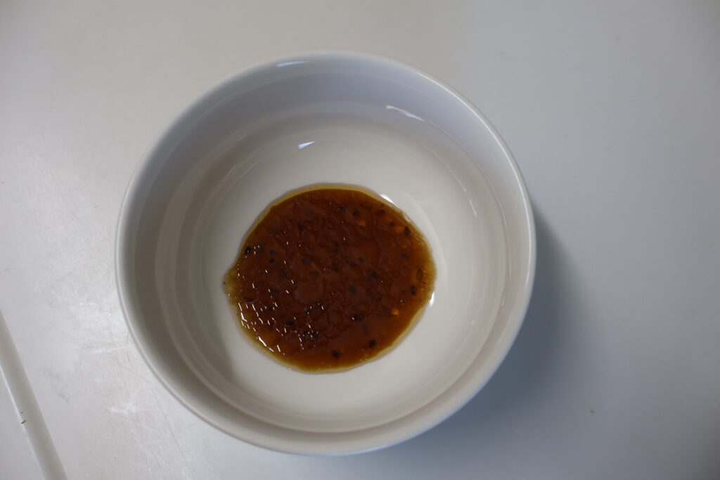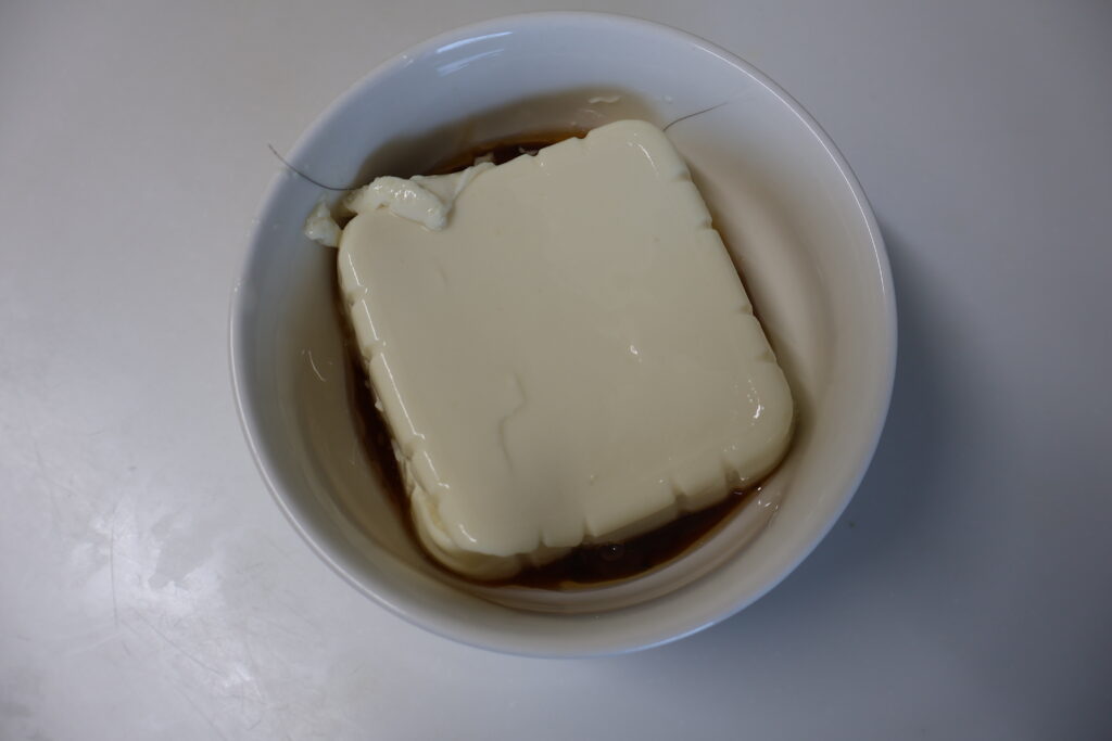 次に器に中華ドレッシングを入れ、そこに豆腐を入れます。