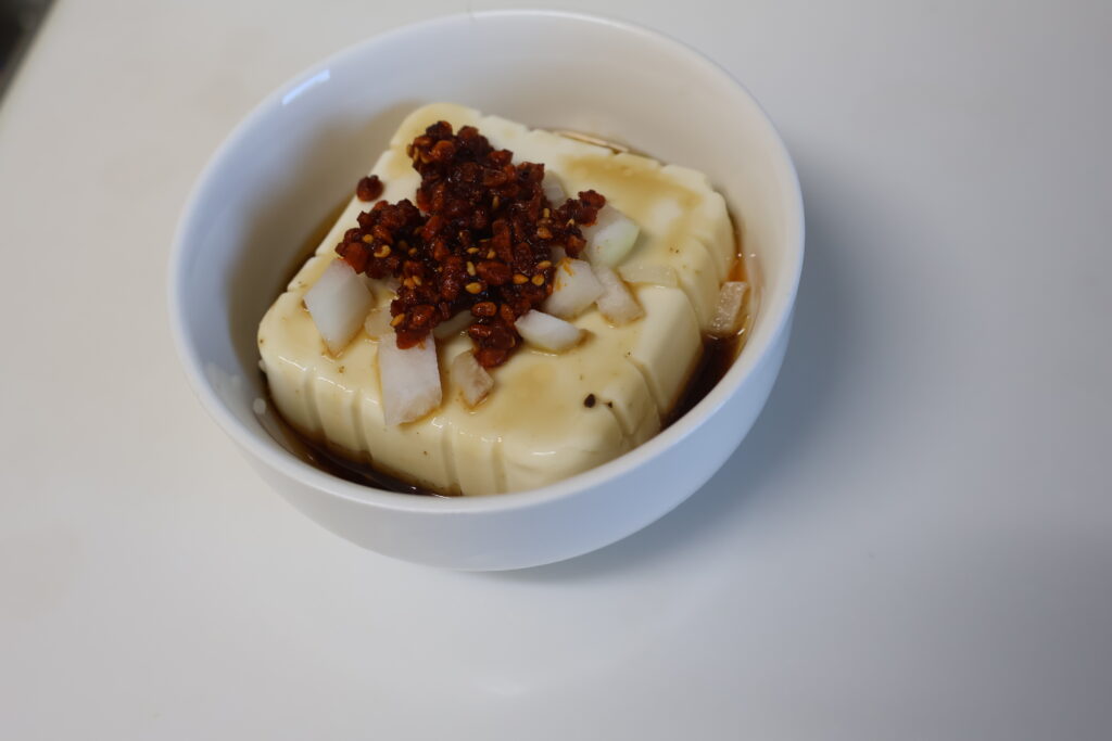 そして微塵切りにした玉葱と「食べるラー油」を豆腐にのせて出来上がりです。